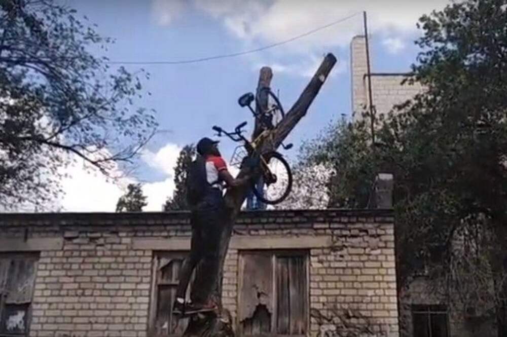 Прокатный велосипед забросили на дерево в Волгограде. Проходящие мимо иностранцы сняли его и вернули на место